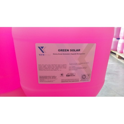 Green Solar; kapalı devre güneş enerji sistemlerinde donma ve kaynama koruması sağlar. Tesisatta akışın daha sağlıklı olmasını ve içerdiği inhibütörler sayesinde metal malzemelerden parçacık kopmasının engellenmesini sağlar. Green Solar Güneş Enerji Sitemleri Organik Koruyucusu içeriğinde çevre ve insan sağlığına zararlı nitrit, amin ve fosfor yoktur. Green Solar konsantre ürünün donma noktası yaklaşık -40 C dir.